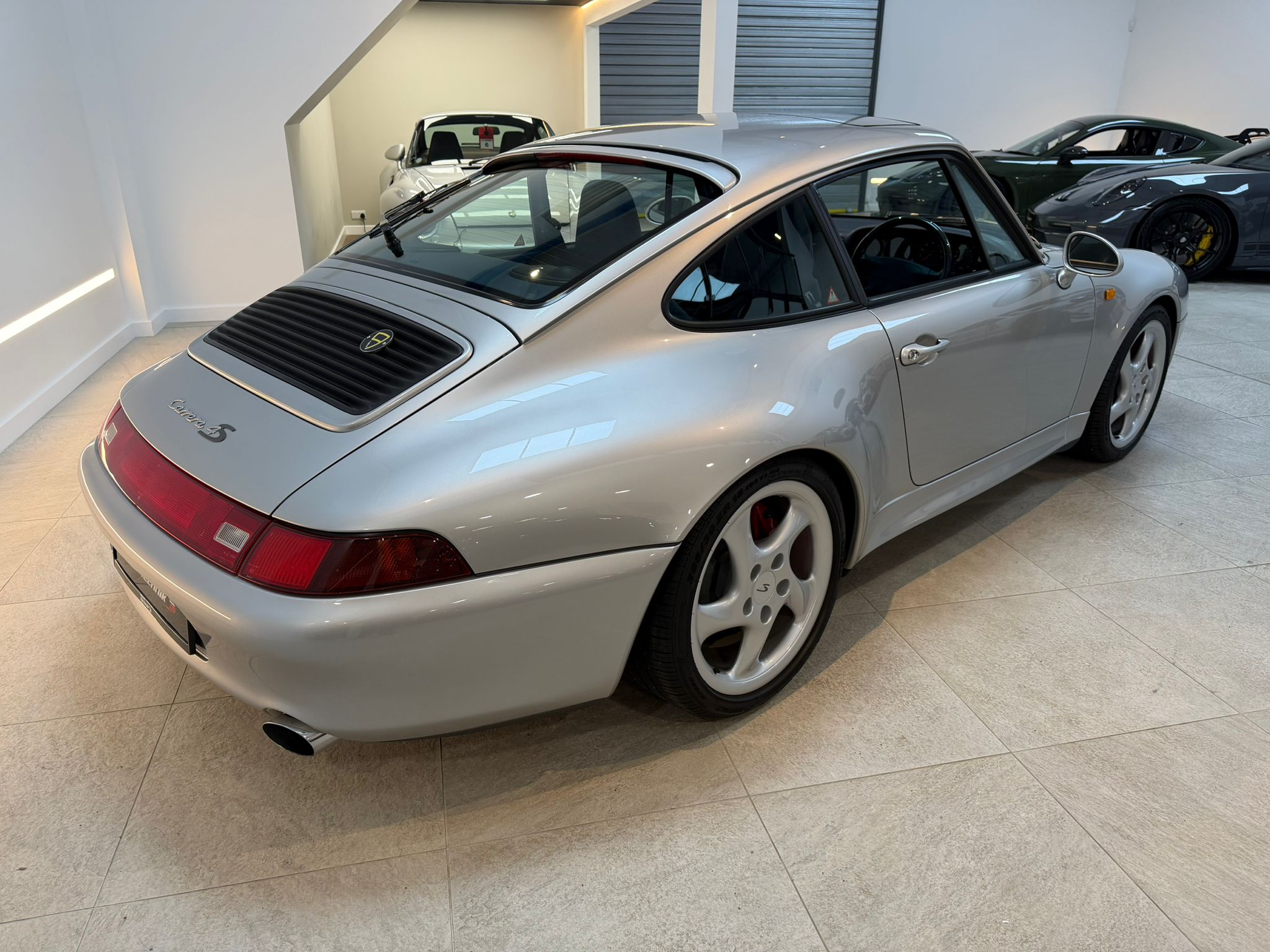 Arctic Silver metallic, Soft Ruffled Midnight Blue leather, 6-Speed manual transmission, Sunroof, Carbon and leather steering wheel, Carbon dashboard trims, Carbon and Aluminium handbrake and gear lever, Top tinted windscreen, Porsche Classic PCCM and 18″ 993 C4S ‘Twist’ wheels in Silver.