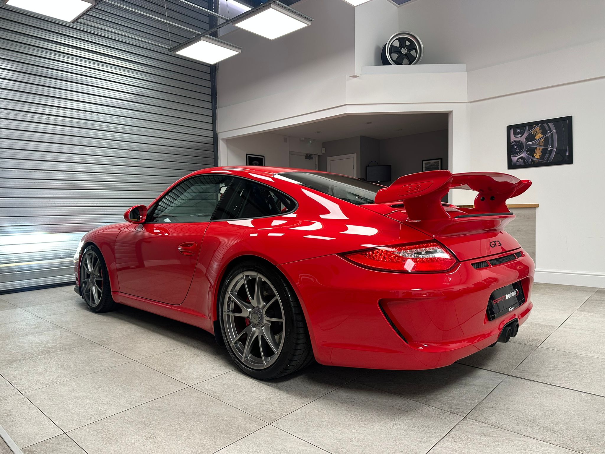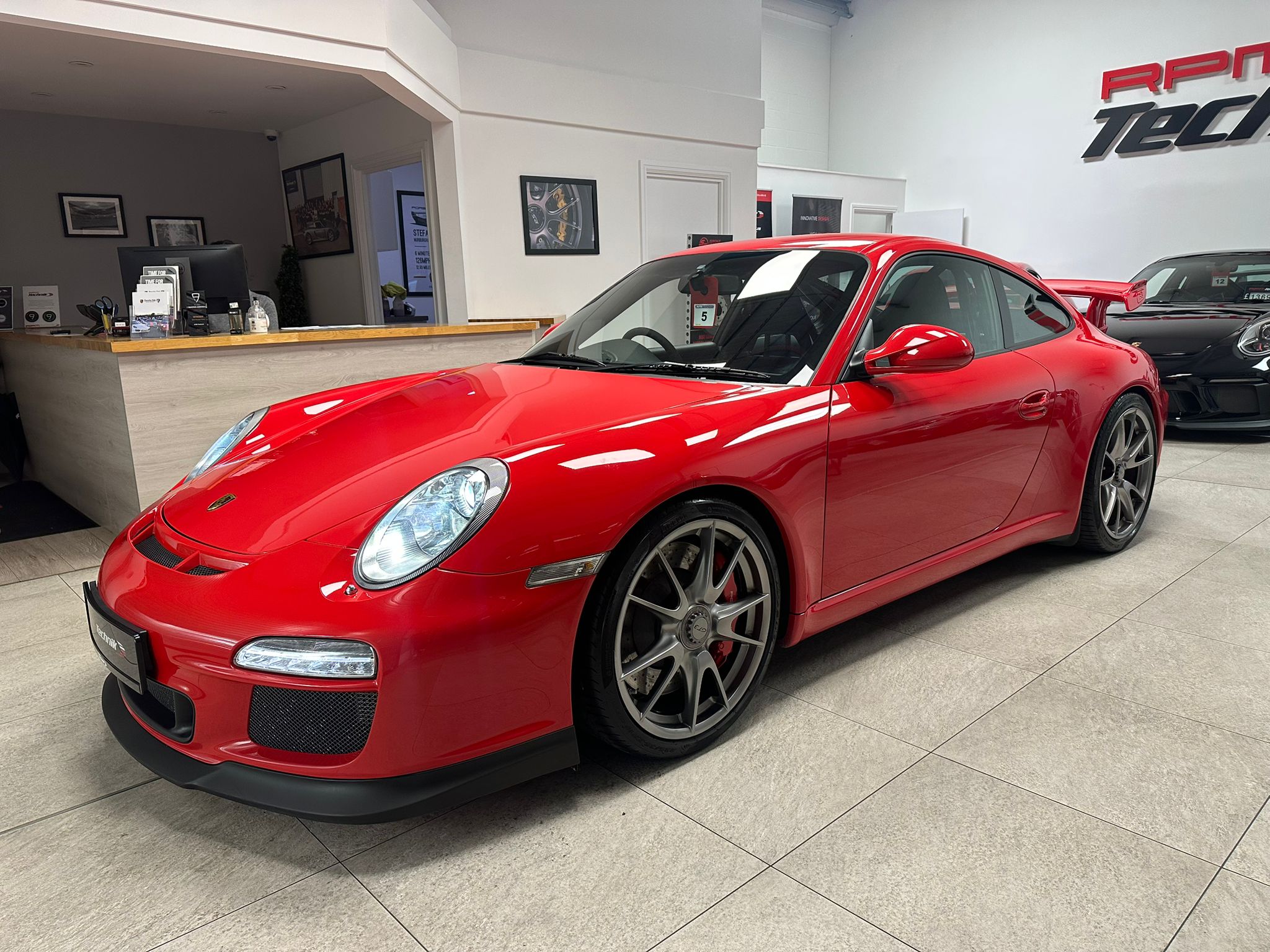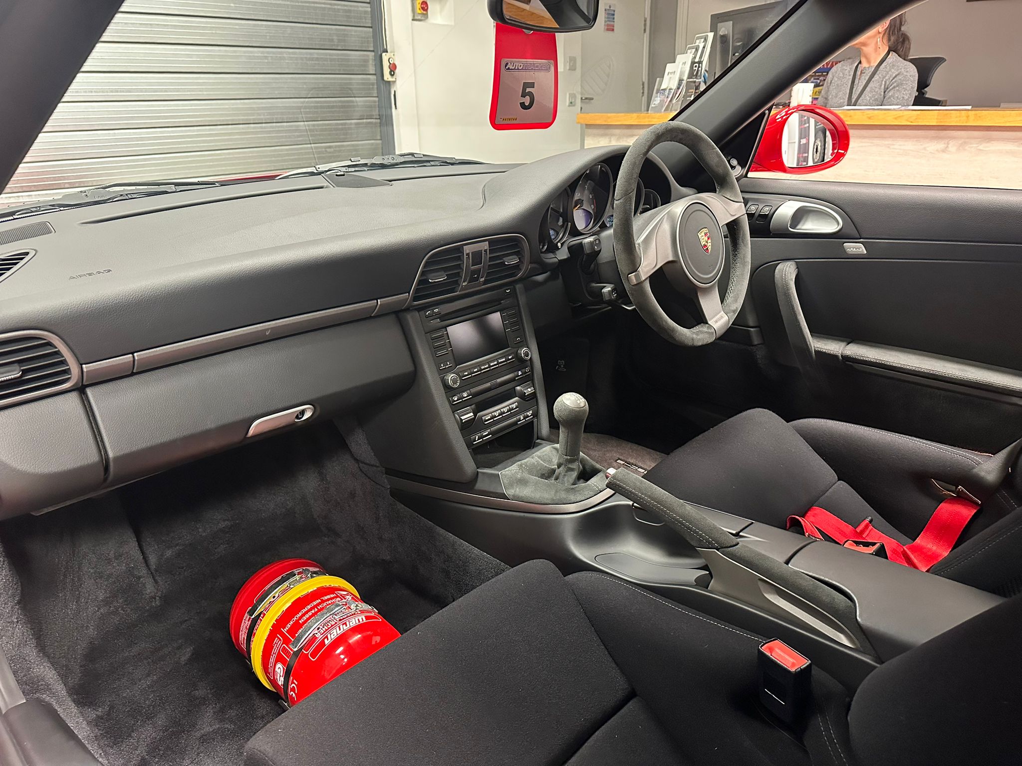 Guards Red, M003 Clubsport package, Nomex sport bucket seats, Xenon lights, Upper part of windscreen tinted, CDR-30 stereo and 19″ GT3 centre lock wheels in Silver.